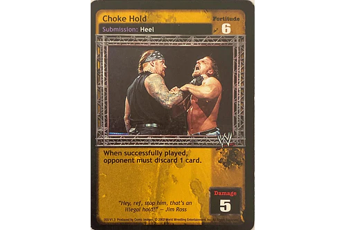 Discard 3 cards of your choice from your hand. All players compare their current Fortitude Rating. The player(s) with a higher Fortitude Rating must remove maneuver and/or reversal cards from their Ring area, putting them into his Ringside pile, until that player's Fortitude Rating is less than or equal to the others.