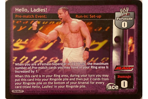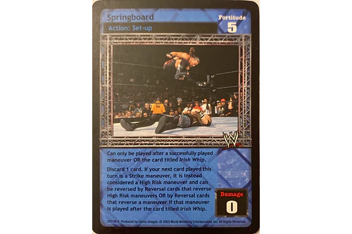 As a reversal, may only reverse the card titled Throw Into the Corner Turnbuckle. Opponent must discard 1 card. You end your opponent's turn; and if your next card played on your turn is a Strike it is +6D or if it is a Grapple your opponent’s reversal will be +12F.