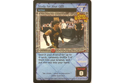 Before damage has been applied from a card successfully played by your opponent, you can remove any number of Face or Heel cards in your Ringside pile from the game and reduce the damage by 2 for each card removed. You may play any cards with the Eddie Guerrero logo, but you do not count as Eddie Guerrero. You cannot play any Title Belts except the Tag Team Title Belts.
